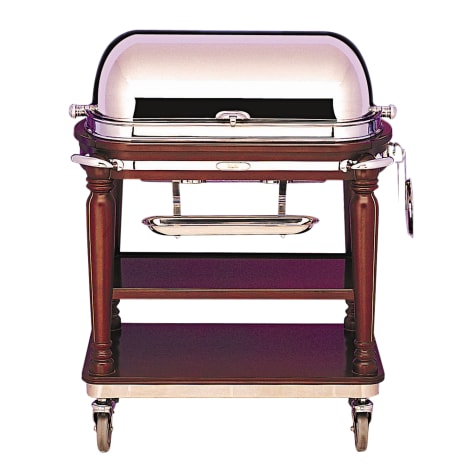 This 42" roast beef trolley features a solid hardwood body with a mahogany finish and a full rollback cover in hotel‐weight, high‐polished stainless steel. The cover is vented to prevent condensation and also has a special locking handle. Underneath the cover are a 15" x 10" white composition carving board, two 40 Oz. stainless steel drop‐in containers, and a stainless steel water pan with adapter. This trolley also includes four handles, a knife tray, a plate holder and four swivel casters (two with locks), all made of stainless steel.