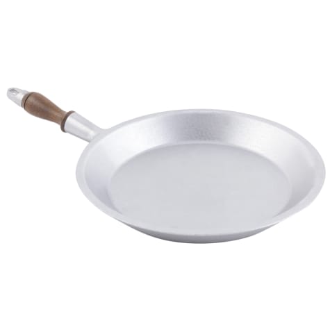 This 8" round crepe pan is made of cast aluminum with a pewter glo finish and has a wooden handle covering.