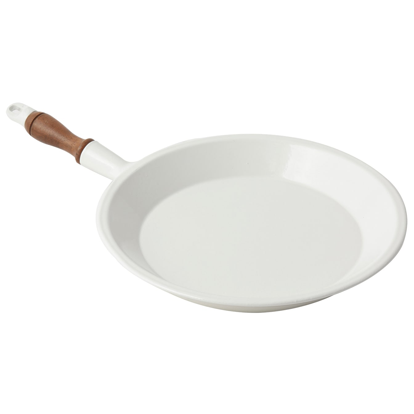 This 10" round crepe pan is made of cast aluminum with a white sandstone finish and has a short handle with a wooden covering.