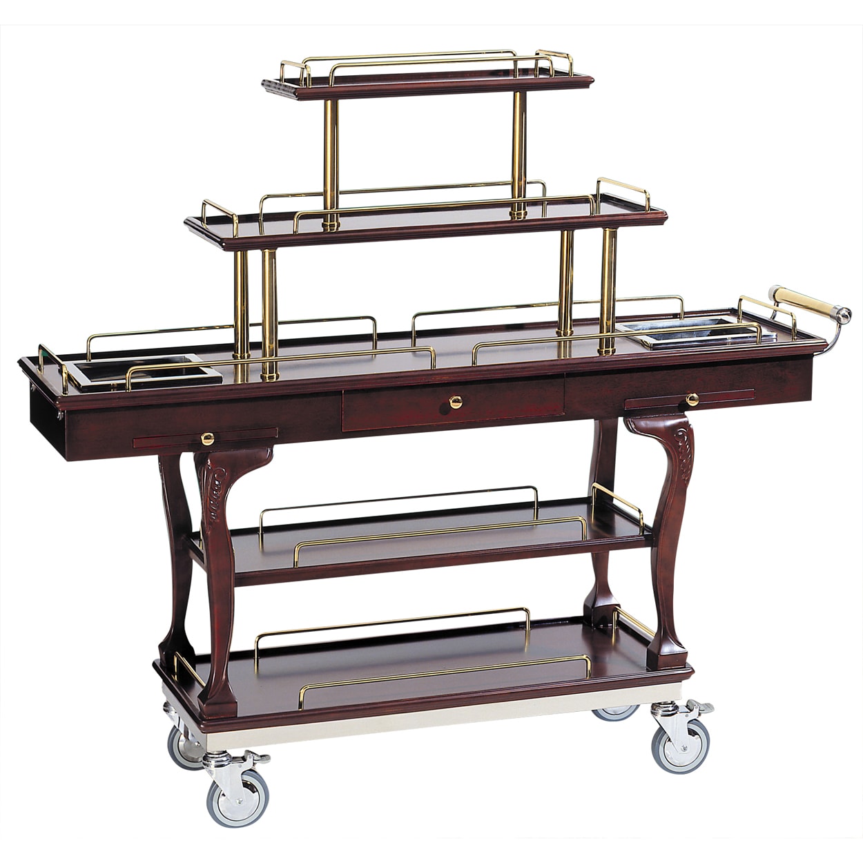 This 62" dessert cart features a solid hardwood body with a mahogany finish and a five‐tier design that covers all your dessert serving needs in one unit. It has three fixed shelves, two pull‐out shelves and one pull‐out flatware drawer, plus two insulated stainless steel pans in the large center shelf. This cart also has brass columns and rails, a stainless steel and brass handle, and four 5" stainless steel swivel casters.