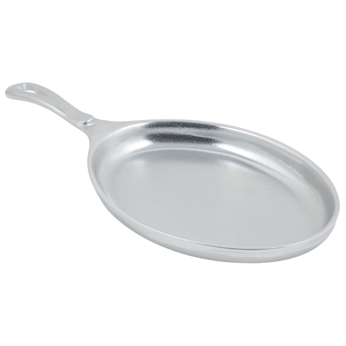 This 18 Oz. oval skillet is made of cast aluminum with a pewter glo finish that is good for hot or cold food and is oven‐safe.