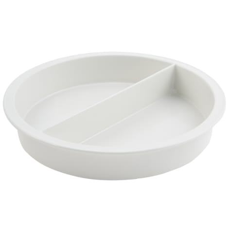 This round 8 Qt. food pan is made of cast aluminum with a White Sandstone finish and is 15" wide, with a divider in the middle for serving different kinds of food at once.