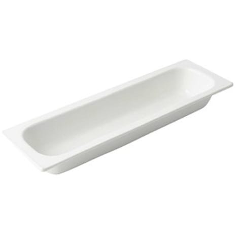 This half size long white food pan from Bon Chef is made from aluminum with a ceramic-look coating.