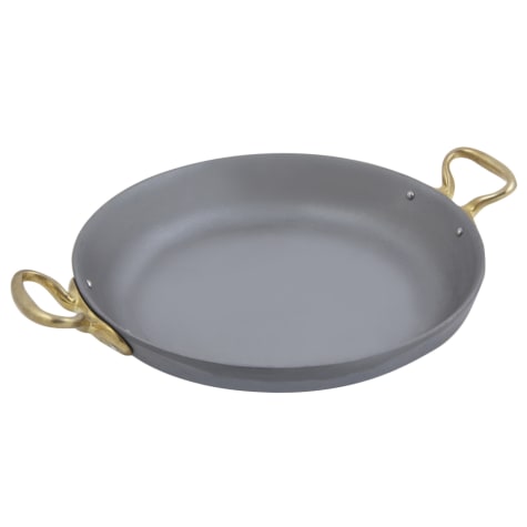 This 2.6 Qt. paella dish is made of cast aluminum with a matte black Tempo finish and has dual brass handles on the sides.