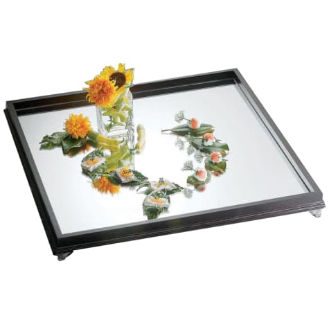 This 30" square tray features a brilliantly reflective glass mirror and a black wood border that give you a presentation quality like nothing else.