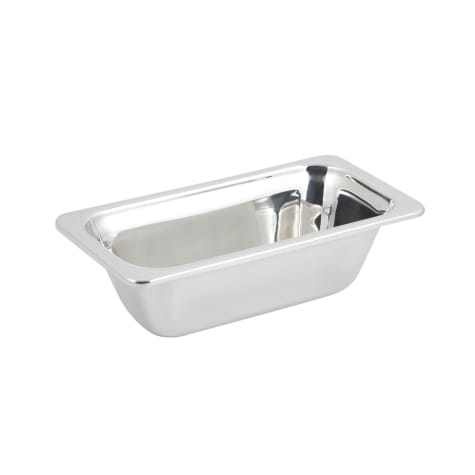 This 2 Qt. third size food pan is 13‐1/16" long and made of durable stainless steel. It features the leafy wreath pattern of the Laurel design.