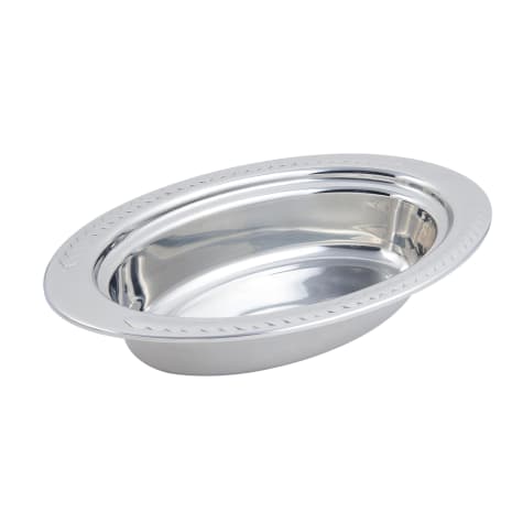 This 19" by 11‐13/16"" oval food pan is made of stainless steel and holds 6 quarts. It features the leafy wreath pattern of the Laurel design.