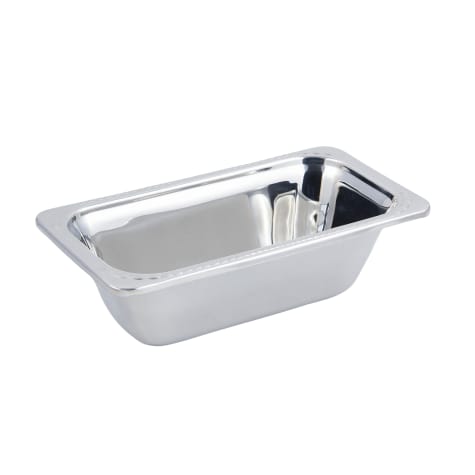 This third size food pan holds 2 quarts, is made of stainless steel, and has the narrow ridges of the Arches design around the rim.