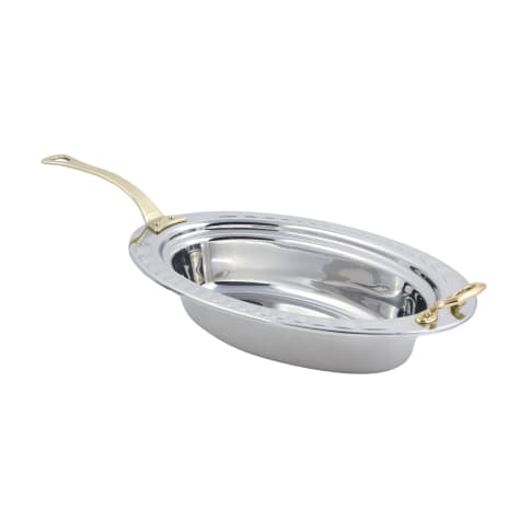 This 6 Qt. oval food pan with long handle is made of stainless steel and has the narrow ridges of the Arches design around the rim.