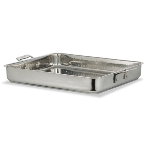 This Bon Chef Cucina Square Pan has a 5 Qt. capacity and is made from stainless steel with a hammered finish. It is induction safe.