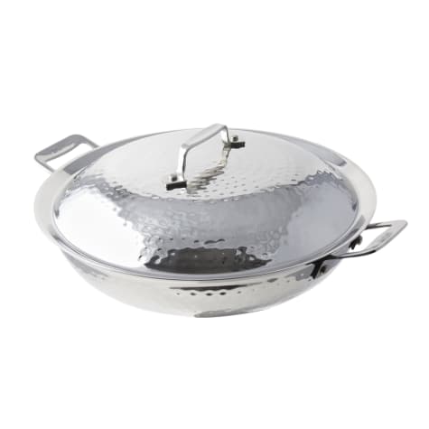 This Bon Chef Cucina Chef's Pan has a 3.5 Qt. capacity and can be used with a variety of foods and sauces. It is made from stainless steel and has a hammered finish. It has handles for ease‐of‐use and includes a lid.