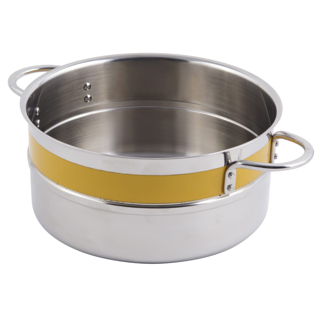 This yellow / silver single wall pot from Bon Chef features stainless steel construction with an aluminum core and is great for steam table use. It is part of the Classic Country French Collection and includes two riveted handles.