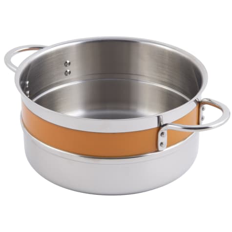 This 4.3 quart single wall pot from Bon Chef is part of the Classic Country French Collection and features anORANGE and sliver color. This pot also features stainless steel construction with an aluminum core and is great for steam table use. It includes two riveted handles and does not include a cover.