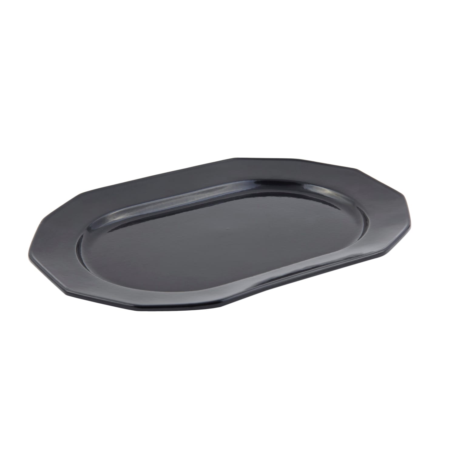 This long 12" x 17" tray is made of cast aluminum with a black sandstone finish and an angular, prism‐style design.