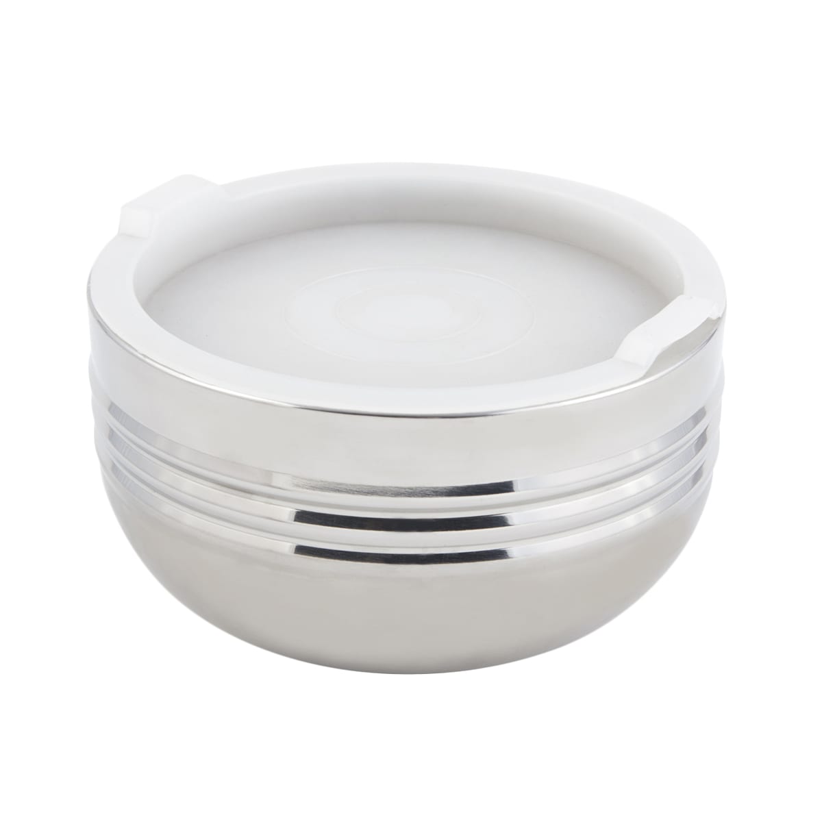 This Cold Wave 2 Qt. bowl is made of stainless steel and has the patented three‐wall design that features a 1/4" outer space that is filled with air and the 1/4" inner space that is filled with an insulating gel. After pre‐freezing, it will keep food cold for 8 hours at ambient temperature without sweating. This bowl also includes a stackable plastic cover.