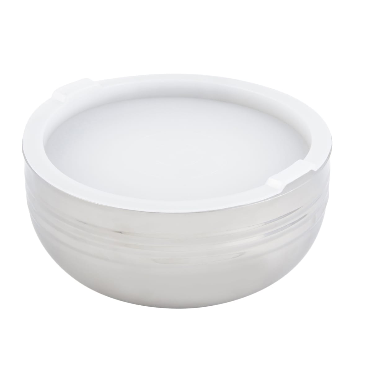 This 3.4 Qt. stainless steel bowl features the patented three‐wall design of the Cold Wave line from Bon Chef. This line has a 1/4" outer layer that contains air and the inner 1/4" layer contains an insulating gel. After pre‐freezing, it will keep food cold for 8 hours at ambient temperature without sweating. This bowl also includes a stackable plastic cover.