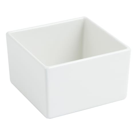 This square 28 Oz. straight sided bowl is made of cast aluminum with a white sandstone finish that looks just like china, but has far better durability.