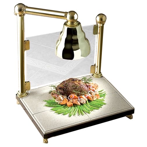 This 24" x 18" carving station features a black sandstone coating on the frame and an almond Bonstone cutting surface, plus a built‐in sneeze guard for better sanitation. The attached heat lamp has 100W of power, and the lamp, legs and handles all have a brass finish.