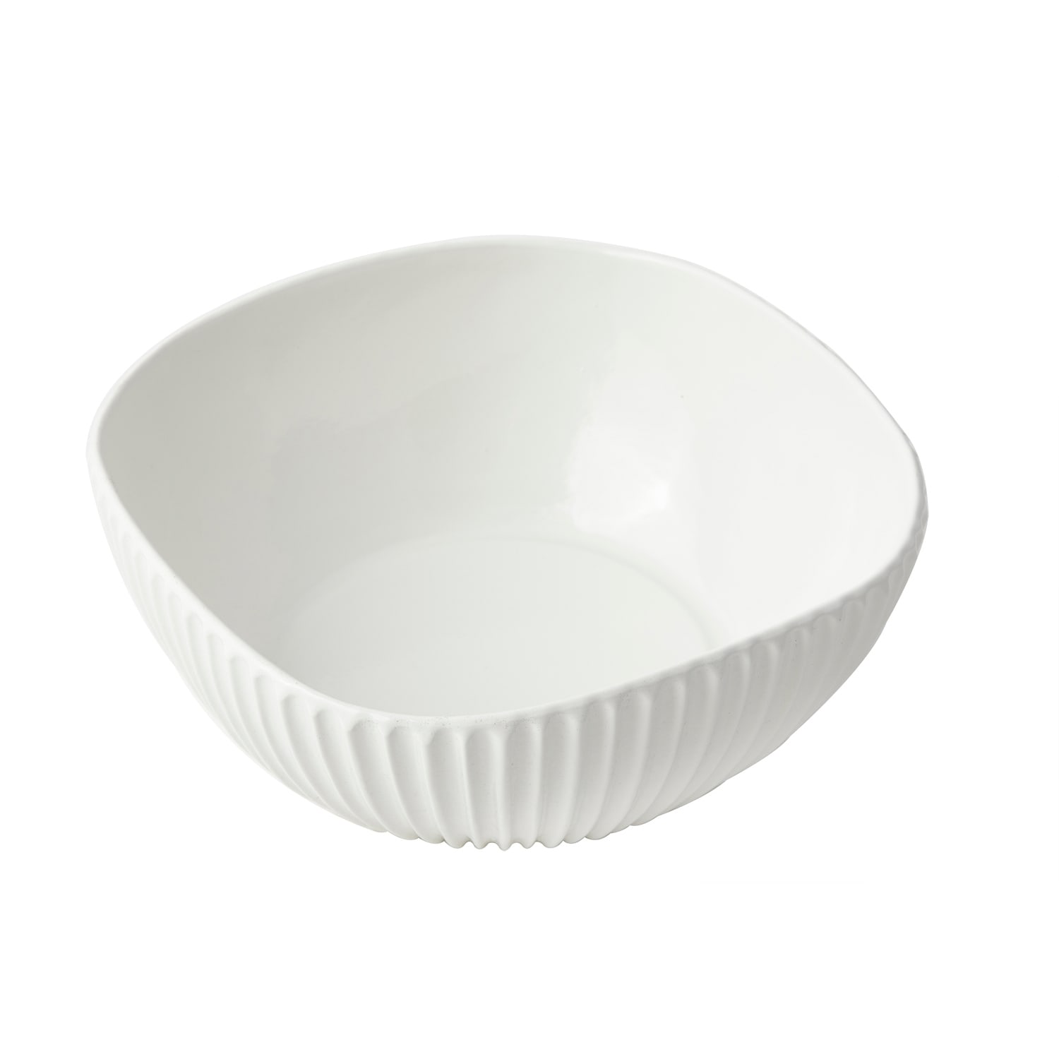 This 10" square bowl is made of cast aluminum with a white sandstone finish and has a ribbed design.