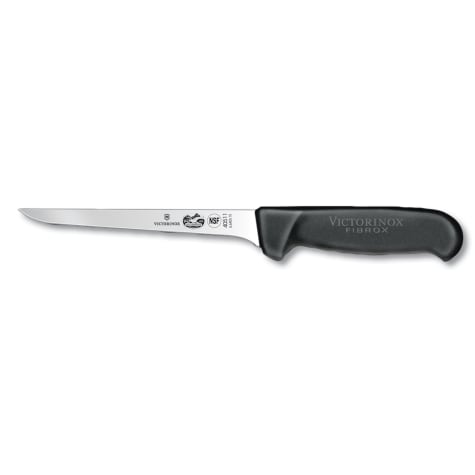 This Victorinox Fibrox® Pro Boning Knife can be used to separate meat, poultry, or fish from the bone. It features a 6" straight, narrow blade that is stiff.