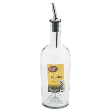This 17.5 ounce clear glass bottle from TableCraft features a stainless steel pourer and is perfect for pouring fresh olive oil, sauces or salad dressings.