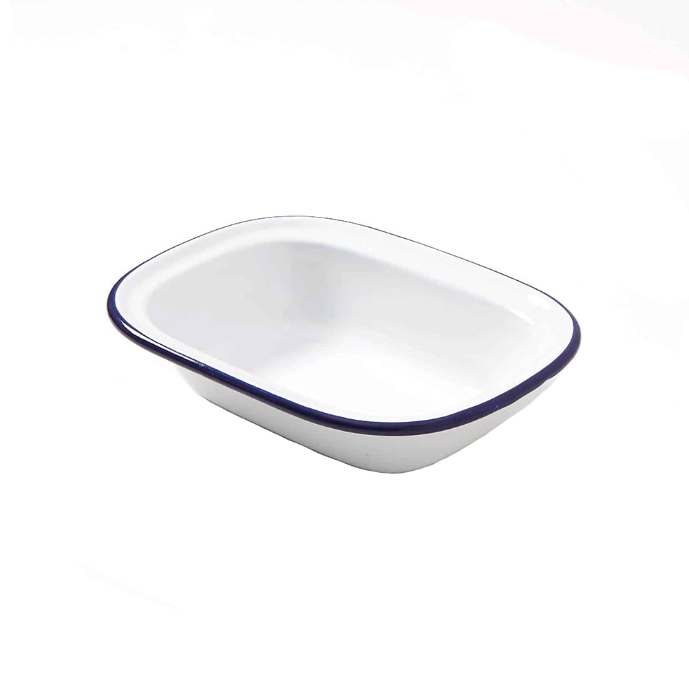 This 16-ounce enamel oblong bowl from American Metalcraft features a white body and a blue rim. Measuring 7-7/8 inches in length, 5-7/8 inches in width, and 1-1/2 inches in height, this bowl is perfect for showcasing breads, salads, and sides. Crafted from durable enamel-coated steel, it combines elegance with practicality for your table setting.