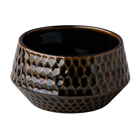 This Bauscher‐Hepp hammered bowl has a black color with metallic gold accents. It is sure to impress.