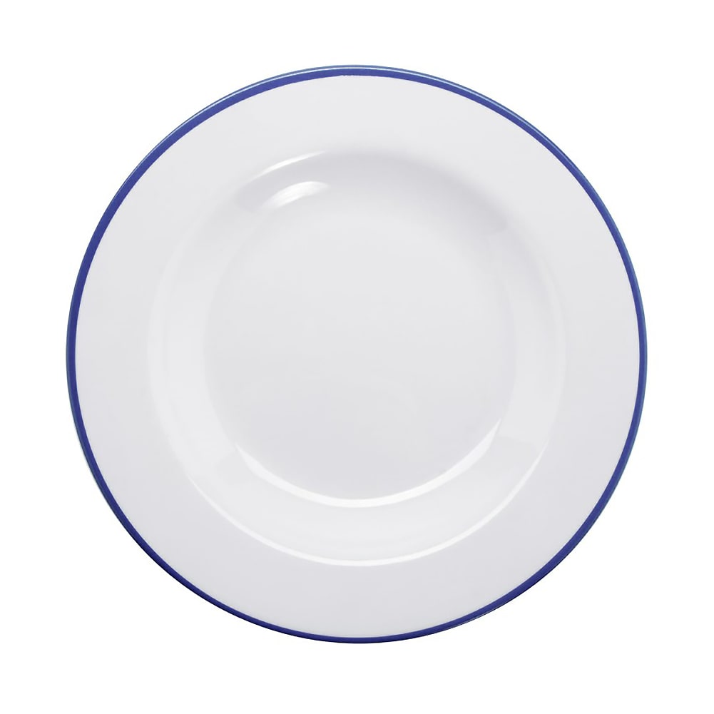 This 24 ounce bowl from G.E.T. is part of the Settlement Bistro Collection and features a white color with cobalt blue trim. Crafted from durable melamine, this bowl combines practicality with vintage cafe-inspired design. Whether you're serving salads, soups, or hearty dishes, this bowl is perfect for your table.