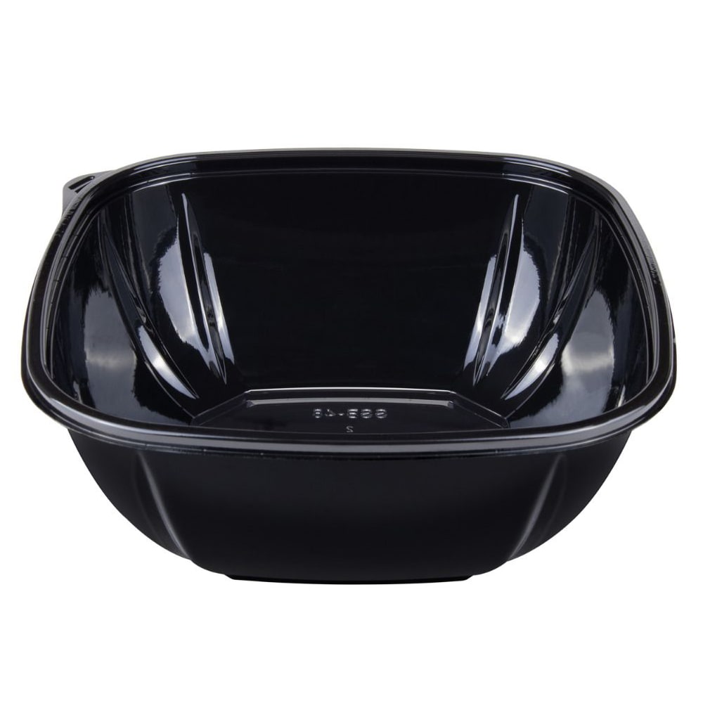 These PET square bowls can store a variety of foods like fruit, fresh salads, and more. This 48 ounce bowl has a black color and square shape offers an attractive presentation of your food to your customers.