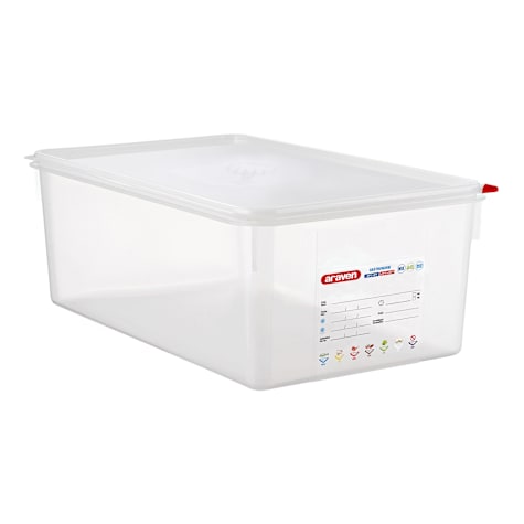 This full size GastroNorm airtight food storage box from Araven has a capacity of 29.6 quarts and is perfect for a variety of food. The double airtight seal will keep food fresh longer while helping to avoid cross contamination. The transparent color makes it easy to identify the contents and is a great choice for use in restaurants. The integrated label allows related information to be recorded for the contents of the container (expiration date, prep date, etc.) The lid has a convenient tab for easy opening and a channel that allows part of the air inside the container to be expelled, reducing the oxidation of food and prolonging its useful life. The color coded ColorClip identification is great for organizing while helping to avoid cross contamination. The rounded corners keep food and debris from accumulating, making cleaning easier! It is dishwasher safe and is safe for temperatures from -40° to 203°F.