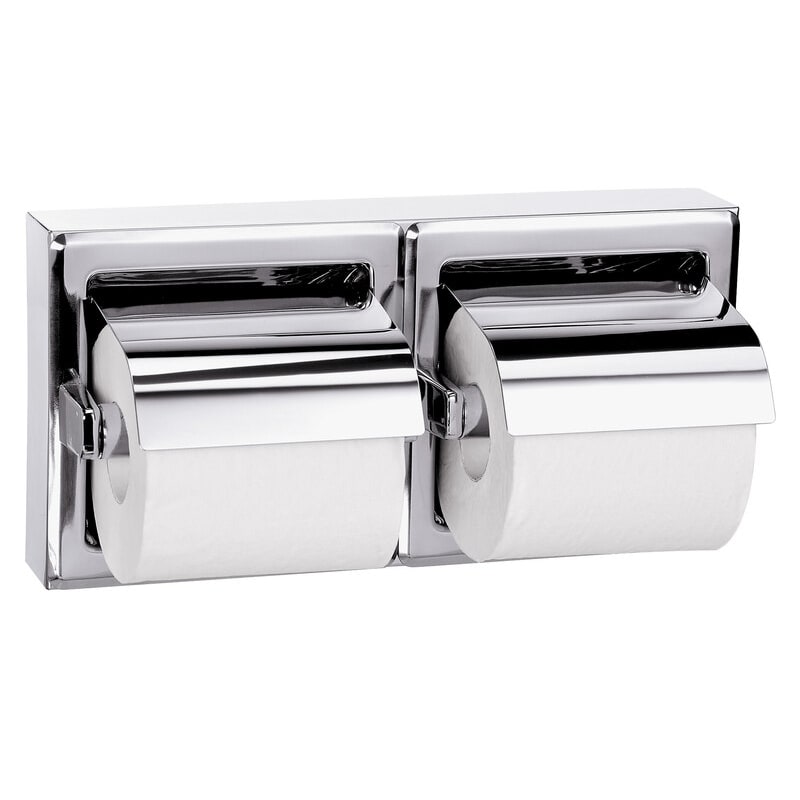This surface-mounted, dual roll toilet paper dispenser is designed for commercial restrooms. Crafted from bright polished stainless steel, it features two hinged hoods and chrome-plated plastic spindles that rotate freely for non-controlled delivery. Each spindle accommodates standard core rolls up to 5-1/2 inches in diameter.