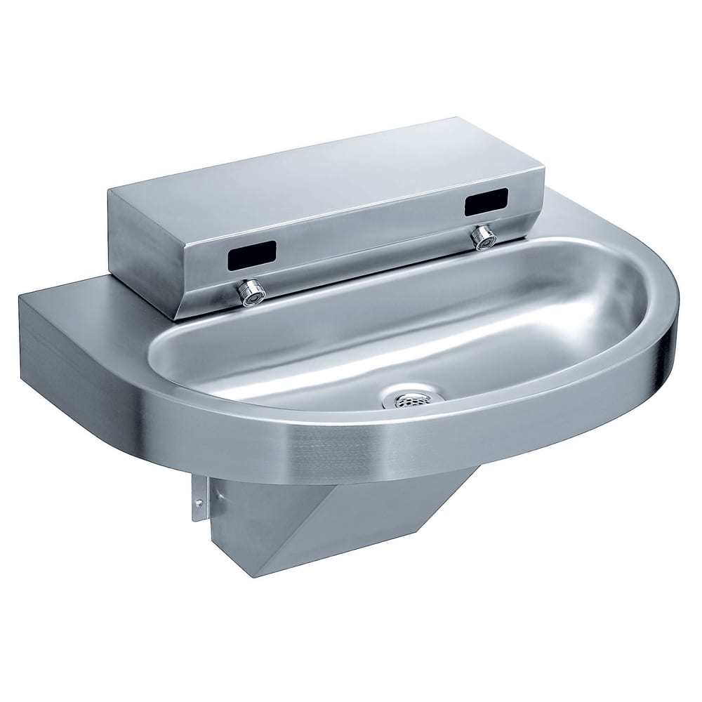 This BradMate™ Washfountain is a wall-mounted, barrier-free handwashing station designed for high-efficiency and durability in commercial settings. Featuring infrared sensors for touch-free activation, it serves up to two users simultaneously while conserving water with a low-flow rate of 0.5 GPM per user. Its semi-circular bowl is constructed from heavy gauge type 304 stainless steel, offering exceptional vandal resistance and long-term reliability. The unit includes a thermostatic mixing valve to maintain consistent water temperature and complies with ADA accessibility standards. Preassembled for quick installation, it's an ideal solution for space-saving, hygienic washroom design.