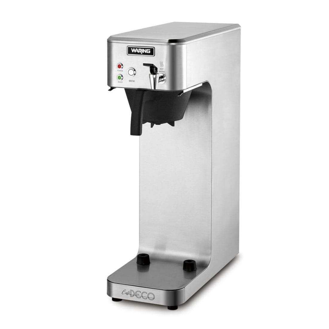 This Waring Cafe Deco airpot coffee brewer produces large amounts of fresh, hot coffee so you will always have plenty available. This unit brews into an airpot to keep coffee hot and also has a hot water faucet for tea or soups.