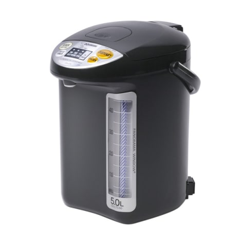 This Zojirushi commercial-grade water boiler and warmer is designed for convenience and efficiency in food service settings. With a 5-liter (169 oz.) capacity, this unit keeps water hot at preset temperatures of 208°F, 195°F, or 175°F, ensuring consistent results for beverages and instant foods. Its Quick Temp mode allows heating without reaching a full boil, while the 7-hour delay timer ensures hot water is ready when needed. The panorama window water level gauge provides easy monitoring, and the nonstick-coated inner container simplifies cleaning. Featuring an automatic dispense-lock for safety, this countertop boiler requires no plumbing, making it ideal for restaurants, cafes, and catering operations.