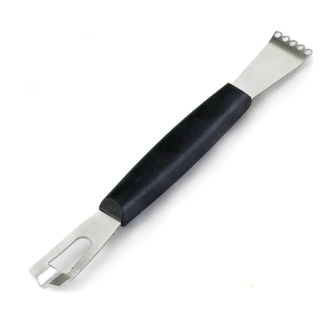 This double lemon zester / channel knife from Browne Foodservice is an essential tool for every kitchen. It is 6.5" long and features durable stainless steel construction with a black polypropylene handle.