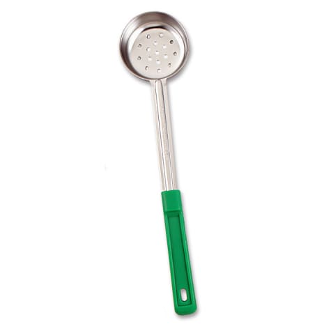 This 10.75" food portioner from Browne Foodservice is perfect for use in any kitchen. It features one‐piece stainless steel construction and a green polypropylene handle.