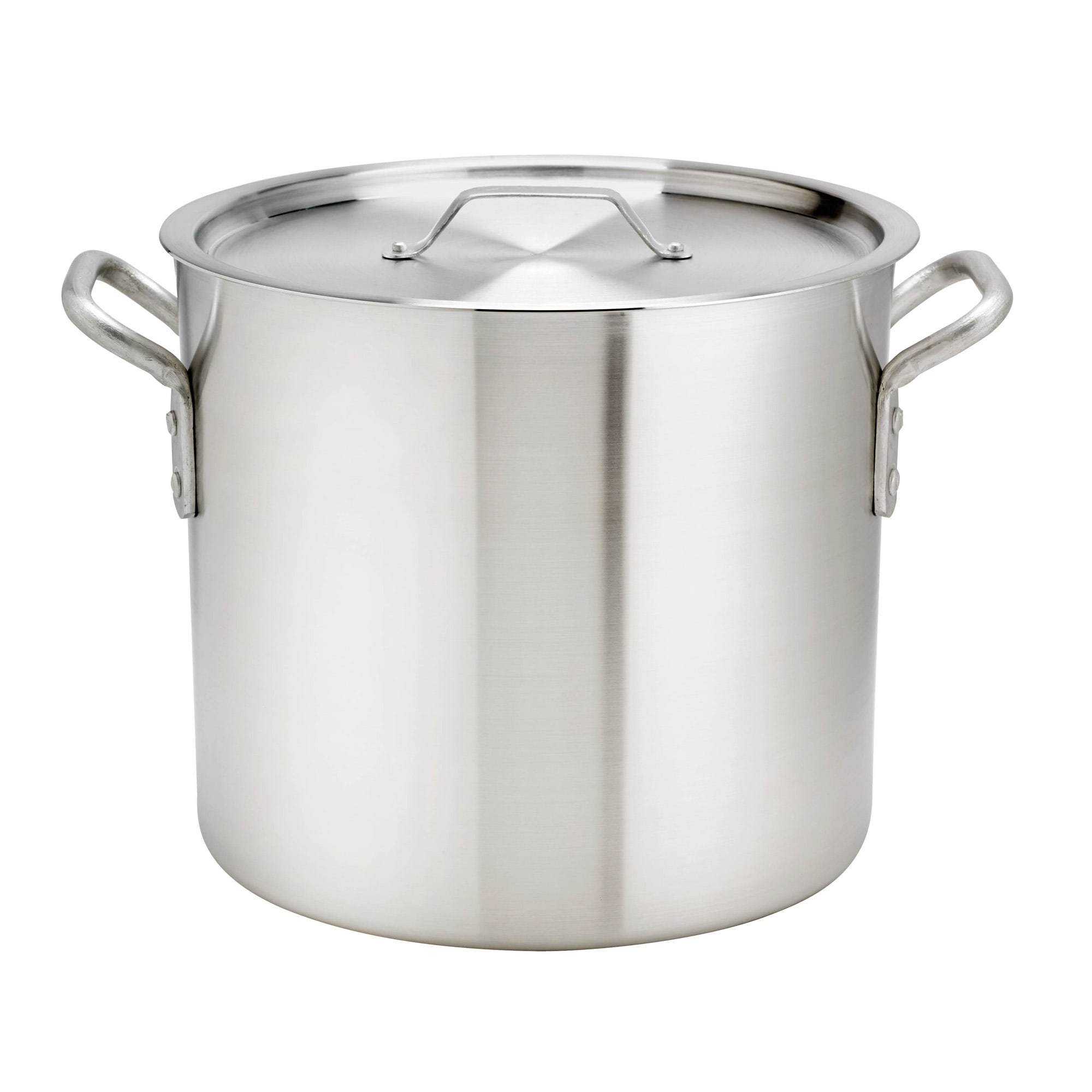 This Thermalloy® stock pot from Browne Foodservice has a capacity of 16 quarts and is made from durable aluminum with a lustrous satin finish. It features oversized handles that are securely fastened with heavy‐duty rivets.
