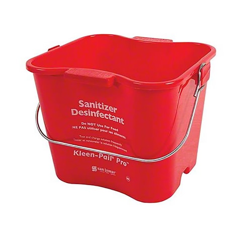Kleen-Pail® Pro™ color-coded pails eliminate confusion between cleaning and sanitizing solution containers. NSF approved, the pail is dishwasher safe, easy to clean, and fits into any HACCP plan. Kleen-Pail Pro's patented, curved shape allows for easy pouring, with molded-in handles for more controlled carrying. The embossed lettering ensures the pail complies with health code, and the trilingual design aids in employee training. Debris-catching ribs at the bottom of the pail catch excess dirt to keep it separated from the towel above.