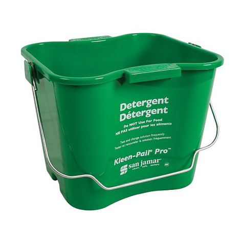 Kleen-Pail® Pro™ color-coded pails eliminate confusion between cleaning and sanitizing solution containers. NSF approved, the pail is dishwasher safe, easy to clean, and fits into any HACCP plan. Kleen-Pail Pro's patented, curved shape allows for easy pouring, with molded-in handles for more controlled carrying. The embossed lettering ensures the pail complies with health code, and the trilingual design aids in employee training. Debris-catching ribs at the bottom of the pail catch excess dirt to keep it separated from the towel above.