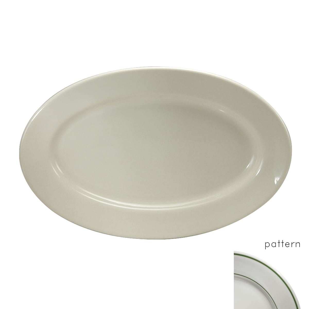 Your culinary creations will be showcased beautifully on this oval platter from the 1880 Hospitality Green line. You will enjoy the ease of handling of this reinforced rolled edge creamy white porcelain.