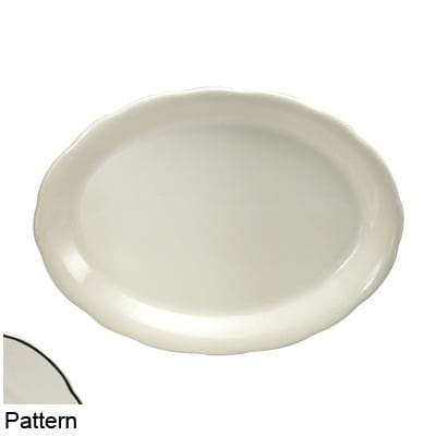 This oval platter from the Manhattan Black line is so versatile that you will enjoy finding new ways to use it. The appealing look of the creamy white porcelain with single black band that accents the scalloped rim, allows you to get creative with your dining presentation.