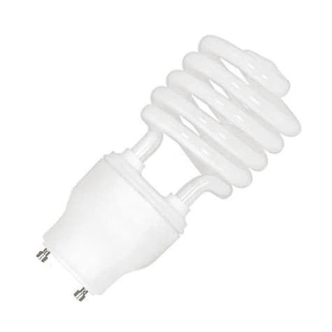 This 23 watt mini spiral compact fluorescent bulb has a GU24 base and has a rating of 10,000 hours .