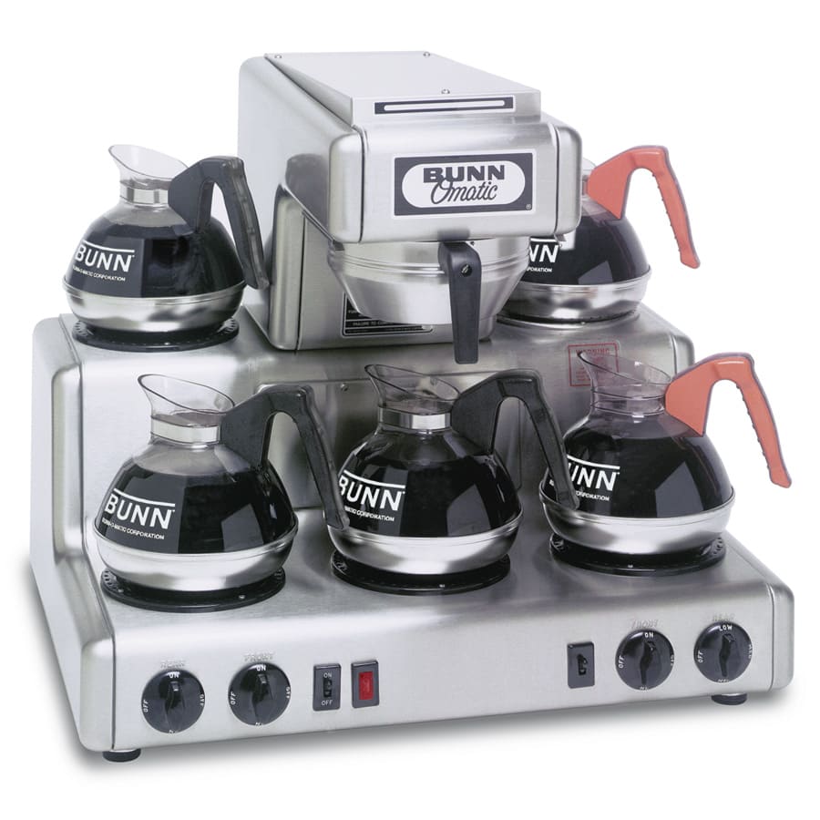 This BUNN® RT Automatic Coffee Brewer features five lower warmers which are all separately operated, allowing for greater user control. This machine also has durable, all stainless steel construction.