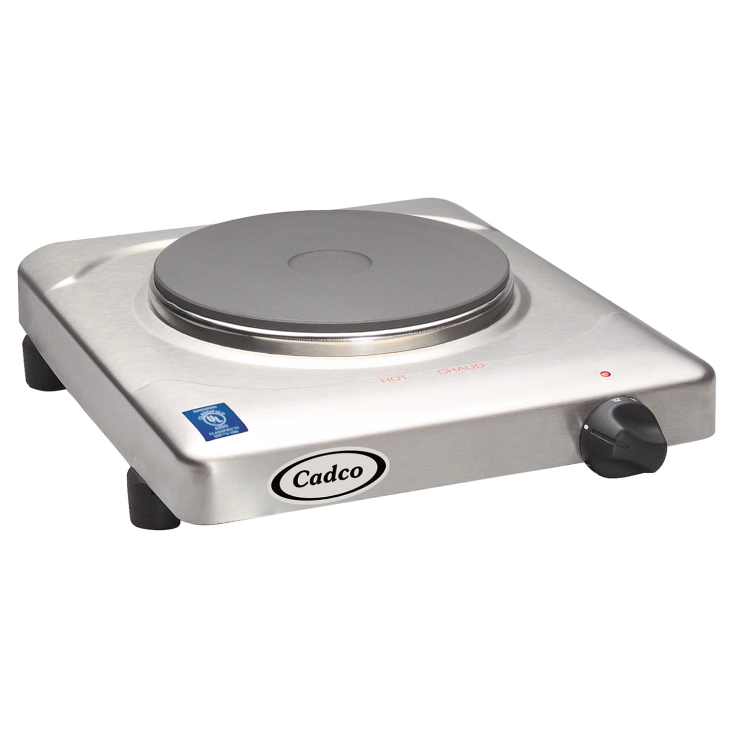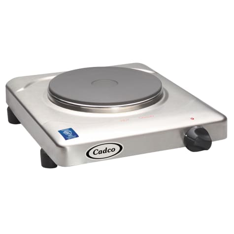 The Cadco KR-S2 is a one-burner electric hot plate portable range with heavy duty 7/8" diameter electric hot plate made of durable cast iron. This electric hot plate portable ranges have infinite heat control dial, stainless steel exterior with cast iron element. The KR-S2 is easy to operate and clean, compact, efficient, and portable. Features safety signal lights and 3-prong grounded plug. NOTE: Max load capacity of 15 pounds if using a stockpot or braising pan no larger than a 1" overhang over element diameter.