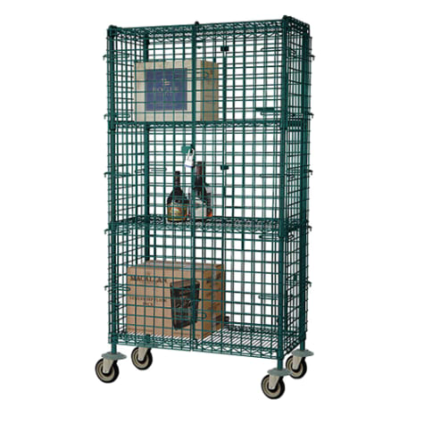 This Mobile Security Cage from Darling Foodservice is a 48-inch by 24-inch storage unit that is 63 inches tall and is designed for securing valuable items in commercial kitchens and storage areas. Featuring a green epoxy finish, it is ideal for wet or dry environments, including walk-in refrigerators. The cage includes three vented shelves, two front panels, two side panels, two back panels, and four swivel casters - two of which have brakes for stability. Its open wire construction ensures visibility, making inventory checks quick and efficient. With minimal components for easy assembly, this NSF-listed security cage provides a durable and organized solution for safeguarding supplies.