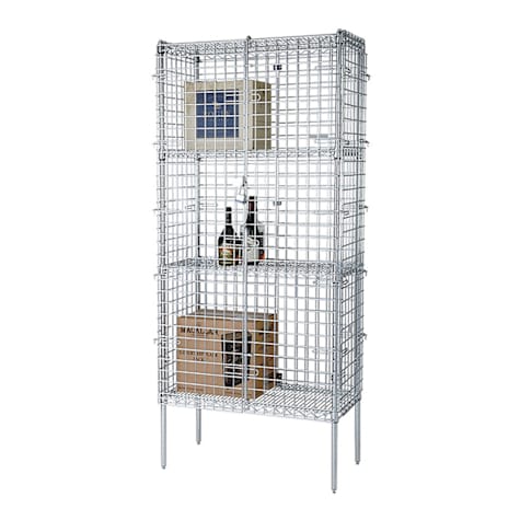 This stationary security cage from Darling Food Service provides protection for valuable products. It features heavy-duty panels with open construction permitting visibility of the entire contents at all times.