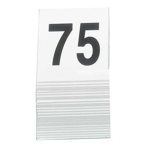 This table number tent from Cal‐Mil is 3" wide, 3" high and is perfect for use in restaurants, diners or banquet facilities. This white number tent is break resistant and features black numbers from 51 to 75 printed on both sides.