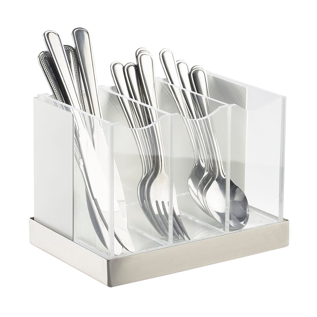 This Luxe flatware organizer is a great addition to your serving table. It has three sections that can be used for spoon, forks, and knives. The clear acrylic dividers provide complete product visibility so guests can easily identify which piece of silverware they're reaching for, making their overall experience more streamlined and enjoyable.