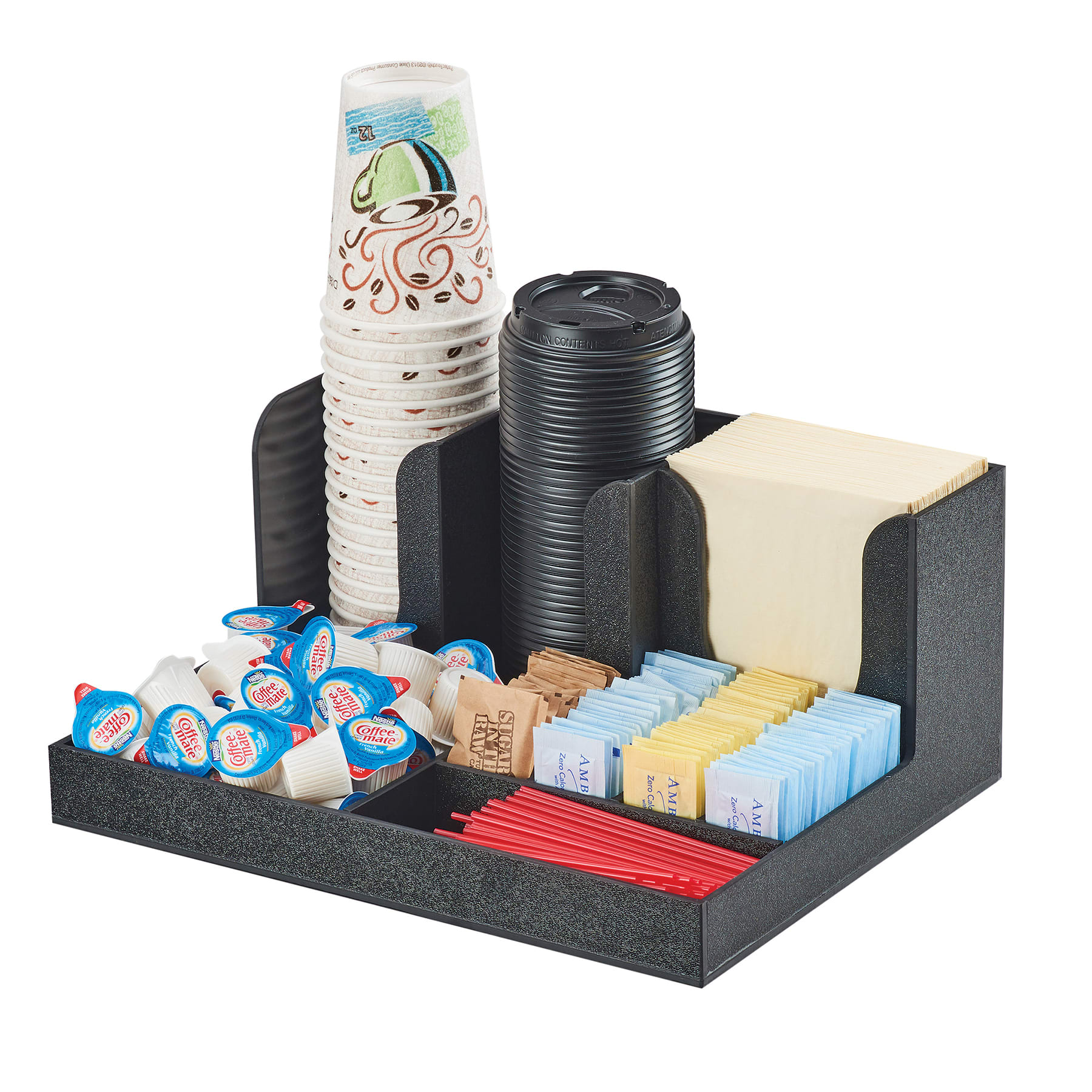 Make this Classic Condiment Station from Cal‐Mil your 1 stop shop for all things Coffee. This condiment station is made of durable, black ABS plastic and has plenty of room for creamers, sugar packets, stir sticks, napkins, lids, and cups. Perfect for coffee stations, break room, cafeterias and buffets.