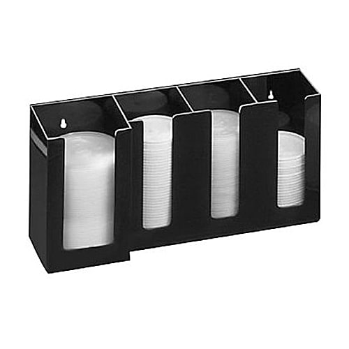 This Cal‐Mil black plastic organizer has 4 compartments, three for lids up to 4" in diameter and one for napkins. It can be wall or counter mounted, hardware not included.